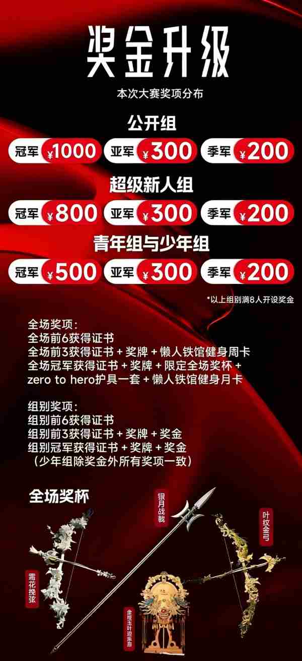 全场奖项: 全场前6获得证书 全场前3获得证书+奖牌+懒人铁馆健身周卡 全场冠军获得证书+奖牌+限定全场奖杯+zerotohero护具一套+懒人铁馆健身月卡 组别奖项: 组别前6获得证书 组别前3获得证书+奖牌+奖金 组别冠军获得证书+奖牌+奖金(少年组除奖金外所有奖项一致)